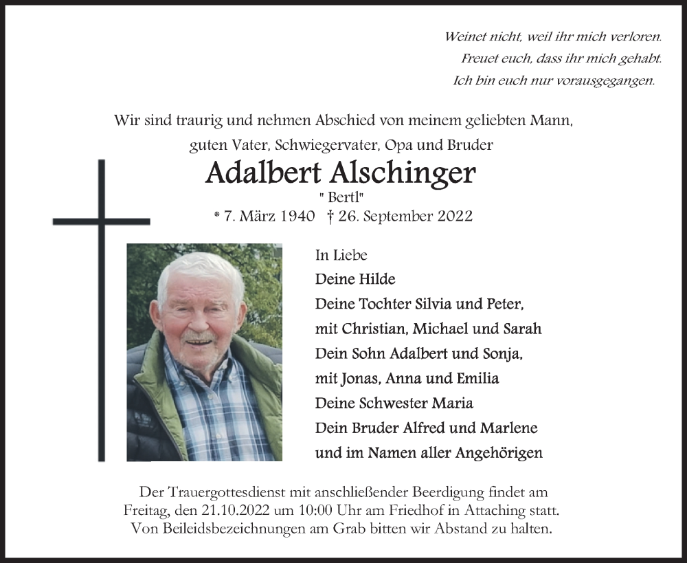 Hier finden Sie alle Traueranzeigen aus der Zeitung, die bisher für Adalbert Alschinger erschienen sind. Weitere Traueranzeigen, die in der Zeitung erscheinen, werden hier ebenfalls aufgelistet