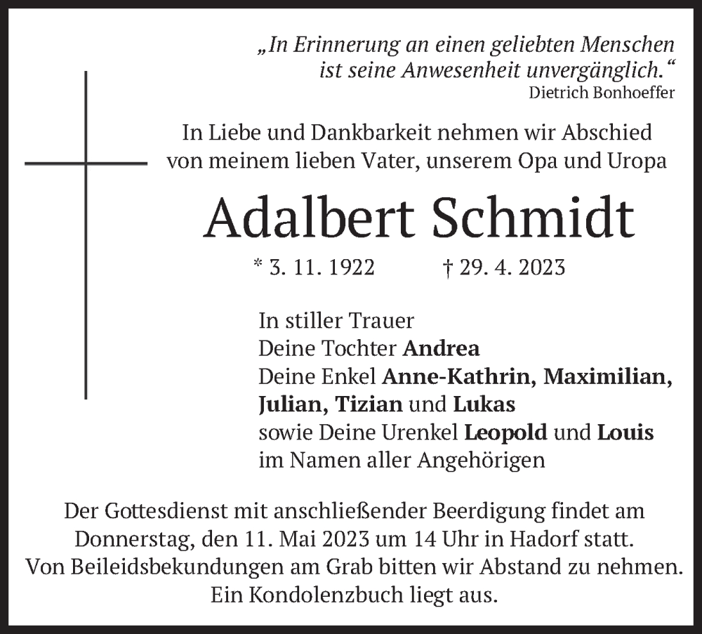 Hier finden Sie alle Traueranzeigen aus der Zeitung, die bisher für Adalbert Schmidt erschienen sind. Weitere Traueranzeigen, die in der Zeitung erscheinen, werden hier ebenfalls aufgelistet