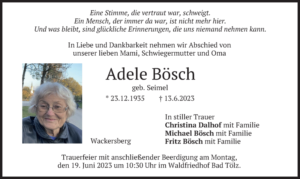 Hier finden Sie alle Traueranzeigen aus der Zeitung, die bisher für Adele Bösch erschienen sind. Weitere Traueranzeigen, die in der Zeitung erscheinen, werden hier ebenfalls aufgelistet