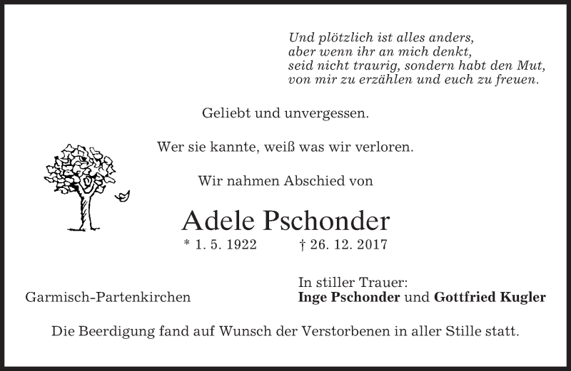 Hier finden Sie alle Traueranzeigen aus der Zeitung, die bisher für Adele Pschonder erschienen sind. Weitere Traueranzeigen, die in der Zeitung erscheinen, werden hier ebenfalls aufgelistet