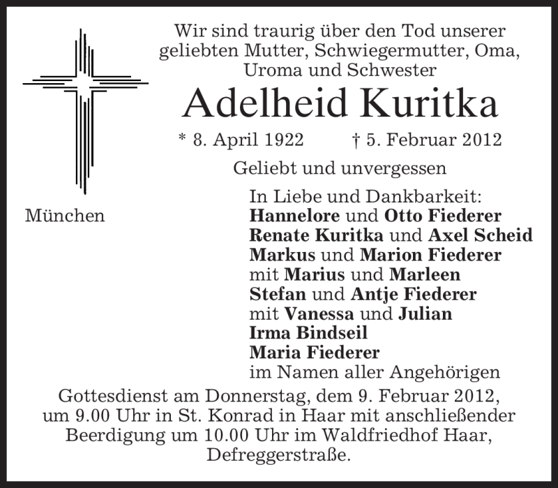 Hier finden Sie alle Traueranzeigen aus der Zeitung, die bisher für Adelheid Kuritka erschienen sind. Weitere Traueranzeigen, die in der Zeitung erscheinen, werden hier ebenfalls aufgelistet