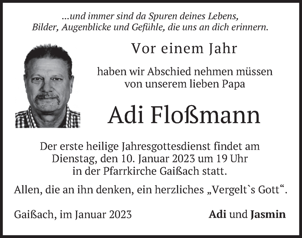 Hier finden Sie alle Traueranzeigen aus der Zeitung, die bisher für Adi Floßmann erschienen sind. Weitere Traueranzeigen, die in der Zeitung erscheinen, werden hier ebenfalls aufgelistet