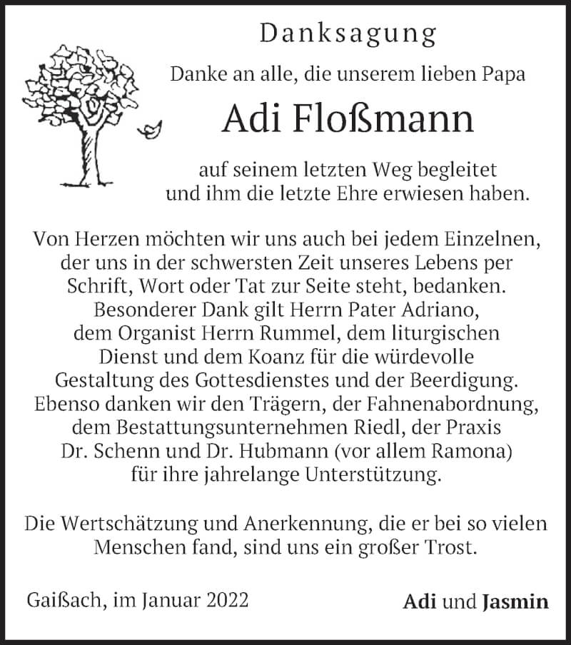 Hier finden Sie alle Traueranzeigen aus der Zeitung, die bisher für Adi Floßmann erschienen sind. Weitere Traueranzeigen, die in der Zeitung erscheinen, werden hier ebenfalls aufgelistet