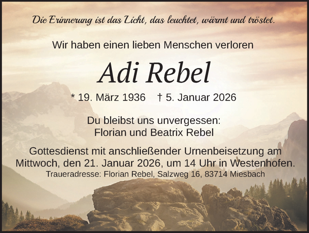 Hier finden Sie alle Traueranzeigen aus der Zeitung, die bisher für Adi Rebel erschienen sind. Weitere Traueranzeigen, die in der Zeitung erscheinen, werden hier ebenfalls aufgelistet