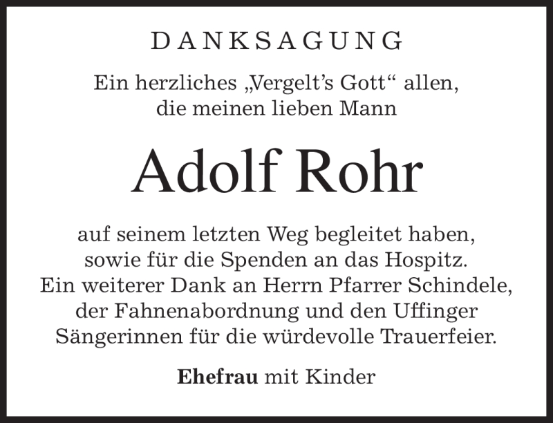 Hier finden Sie alle Traueranzeigen aus der Zeitung, die bisher für Adolf Rohr erschienen sind. Weitere Traueranzeigen, die in der Zeitung erscheinen, werden hier ebenfalls aufgelistet