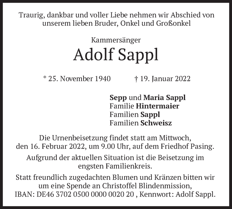Hier finden Sie alle Traueranzeigen aus der Zeitung, die bisher für Adolf Sappl erschienen sind. Weitere Traueranzeigen, die in der Zeitung erscheinen, werden hier ebenfalls aufgelistet