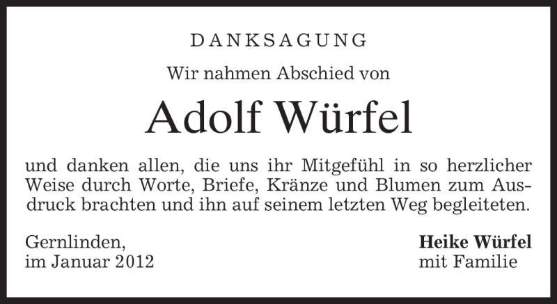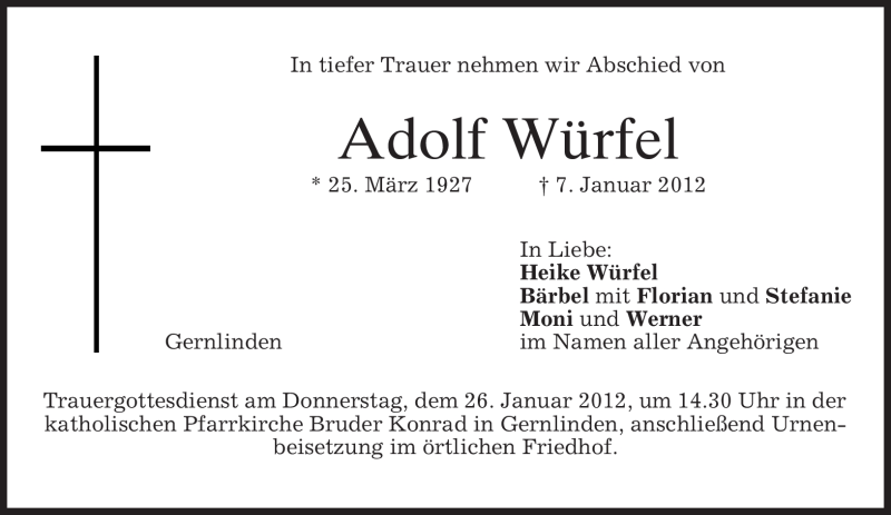 Hier finden Sie alle Traueranzeigen aus der Zeitung, die bisher für Adolf Würfel erschienen sind. Weitere Traueranzeigen, die in der Zeitung erscheinen, werden hier ebenfalls aufgelistet
