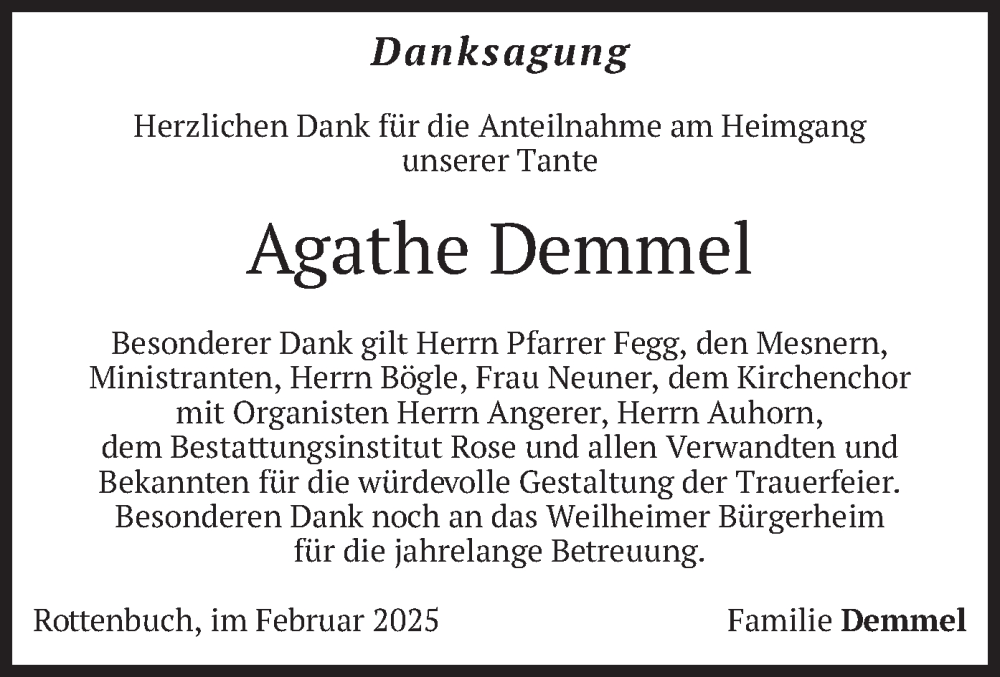 Hier finden Sie alle Traueranzeigen aus der Zeitung, die bisher für Agathe Demmel erschienen sind. Weitere Traueranzeigen, die in der Zeitung erscheinen, werden hier ebenfalls aufgelistet