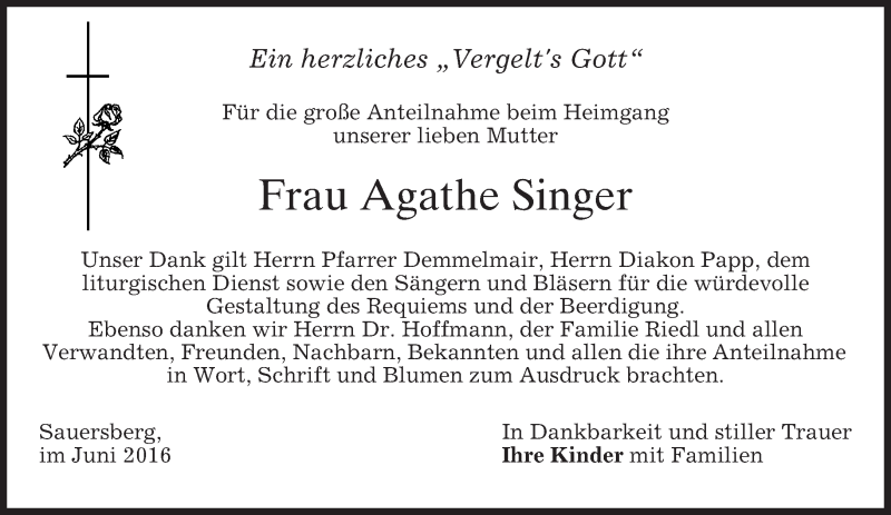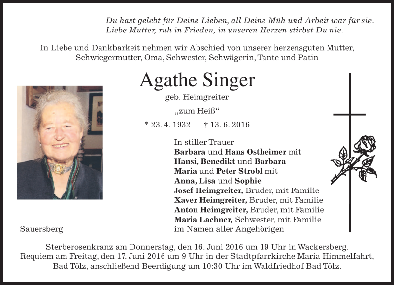 Hier finden Sie alle Traueranzeigen aus der Zeitung, die bisher für Agathe Singer erschienen sind. Weitere Traueranzeigen, die in der Zeitung erscheinen, werden hier ebenfalls aufgelistet