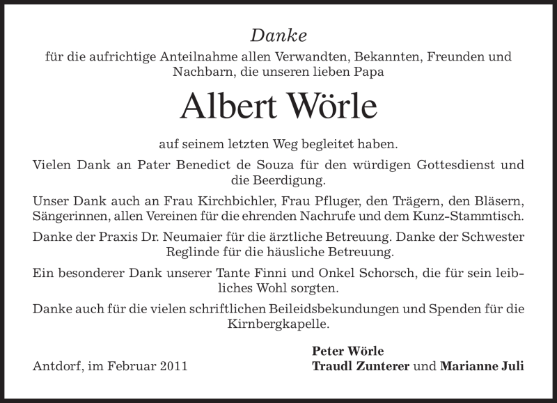 Hier finden Sie alle Traueranzeigen aus der Zeitung, die bisher für Albert Wörle erschienen sind. Weitere Traueranzeigen, die in der Zeitung erscheinen, werden hier ebenfalls aufgelistet