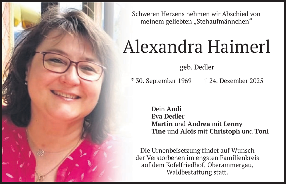 Hier finden Sie alle Traueranzeigen aus der Zeitung, die bisher für Alexandra Haimerl erschienen sind. Weitere Traueranzeigen, die in der Zeitung erscheinen, werden hier ebenfalls aufgelistet