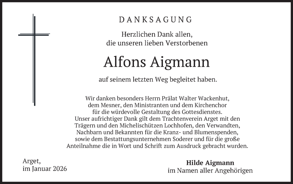 Hier finden Sie alle Traueranzeigen aus der Zeitung, die bisher für Alfons Aigmann erschienen sind. Weitere Traueranzeigen, die in der Zeitung erscheinen, werden hier ebenfalls aufgelistet