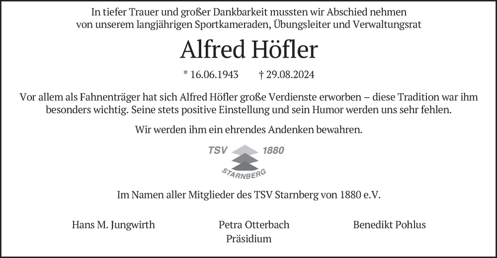 Hier finden Sie alle Traueranzeigen aus der Zeitung, die bisher für Alfred Höfler erschienen sind. Weitere Traueranzeigen, die in der Zeitung erscheinen, werden hier ebenfalls aufgelistet