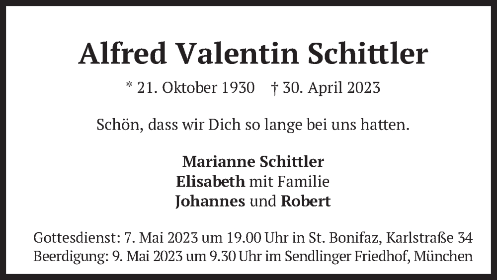 Hier finden Sie alle Traueranzeigen aus der Zeitung, die bisher für Alfred Valentin Schittler erschienen sind. Weitere Traueranzeigen, die in der Zeitung erscheinen, werden hier ebenfalls aufgelistet