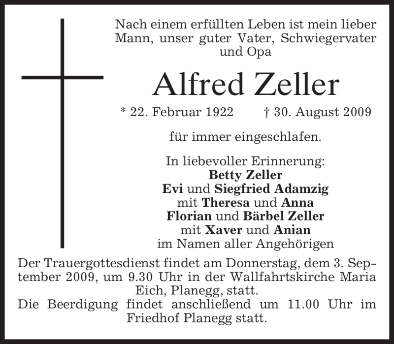 Hier finden Sie alle Traueranzeigen aus der Zeitung, die bisher für Alfred Zeller erschienen sind. Weitere Traueranzeigen, die in der Zeitung erscheinen, werden hier ebenfalls aufgelistet