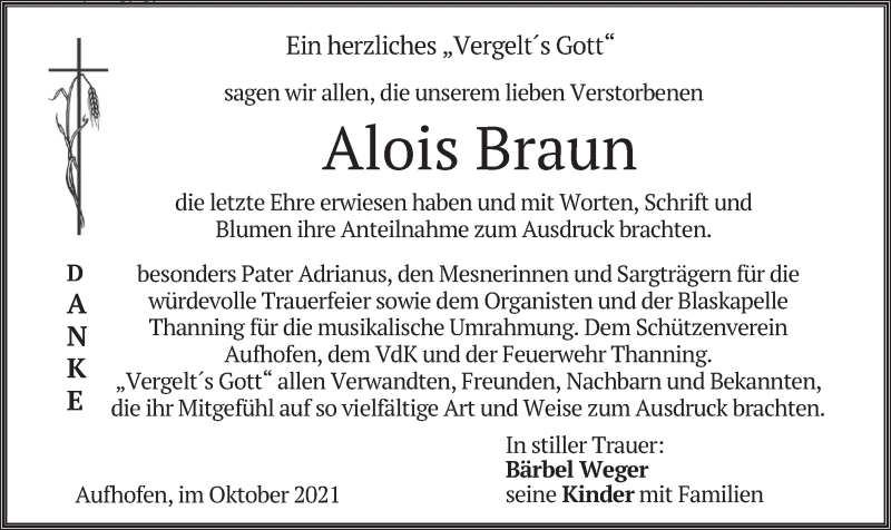 Hier finden Sie alle Traueranzeigen aus der Zeitung, die bisher für Alois Braun erschienen sind. Weitere Traueranzeigen, die in der Zeitung erscheinen, werden hier ebenfalls aufgelistet