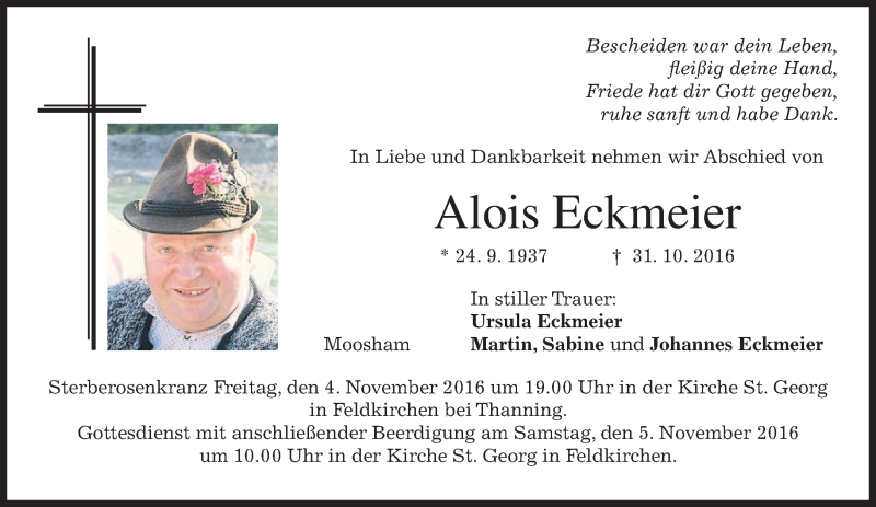 Hier finden Sie alle Traueranzeigen aus der Zeitung, die bisher für Alois Eckmeier erschienen sind. Weitere Traueranzeigen, die in der Zeitung erscheinen, werden hier ebenfalls aufgelistet