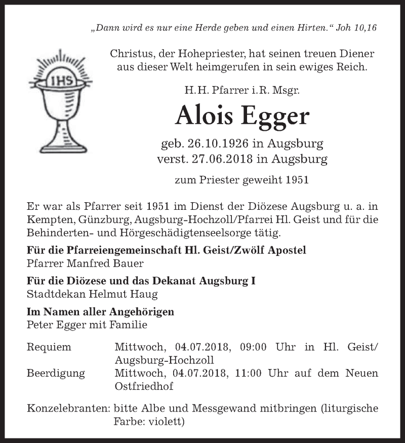 Hier finden Sie alle Traueranzeigen aus der Zeitung, die bisher für Alois Egger erschienen sind. Weitere Traueranzeigen, die in der Zeitung erscheinen, werden hier ebenfalls aufgelistet