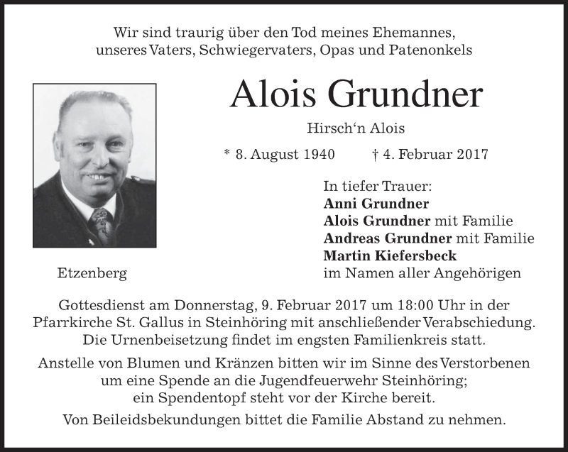 Hier finden Sie alle Traueranzeigen aus der Zeitung, die bisher für Alois Grundner erschienen sind. Weitere Traueranzeigen, die in der Zeitung erscheinen, werden hier ebenfalls aufgelistet