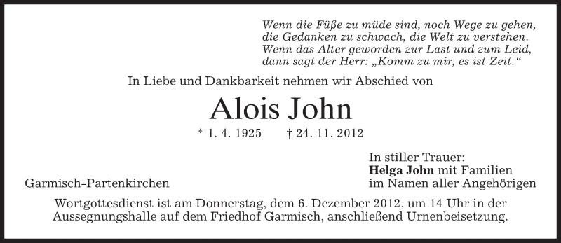 Hier finden Sie alle Traueranzeigen aus der Zeitung, die bisher für Alois John erschienen sind. Weitere Traueranzeigen, die in der Zeitung erscheinen, werden hier ebenfalls aufgelistet
