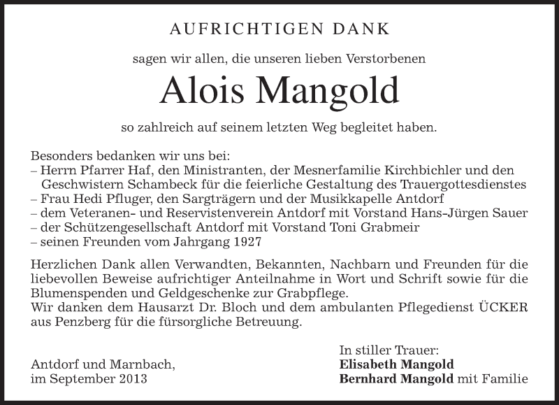 Hier finden Sie alle Traueranzeigen aus der Zeitung, die bisher für Alois Mangold erschienen sind. Weitere Traueranzeigen, die in der Zeitung erscheinen, werden hier ebenfalls aufgelistet