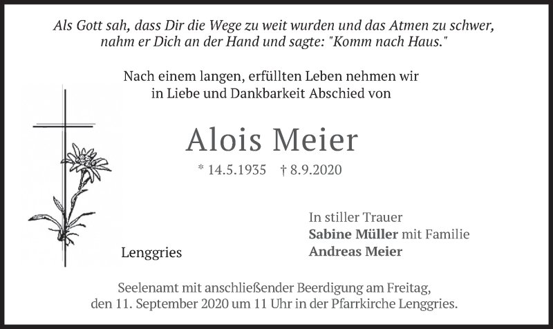 Hier finden Sie alle Traueranzeigen aus der Zeitung, die bisher für Alois Meier erschienen sind. Weitere Traueranzeigen, die in der Zeitung erscheinen, werden hier ebenfalls aufgelistet