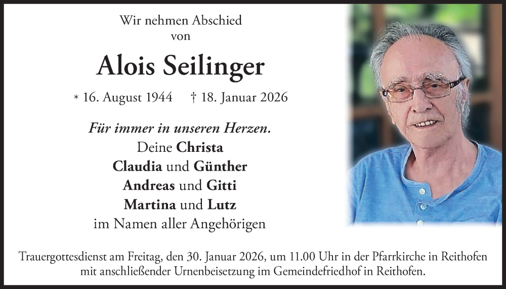 Hier finden Sie alle Traueranzeigen aus der Zeitung, die bisher für Alois Seilinger erschienen sind. Weitere Traueranzeigen, die in der Zeitung erscheinen, werden hier ebenfalls aufgelistet