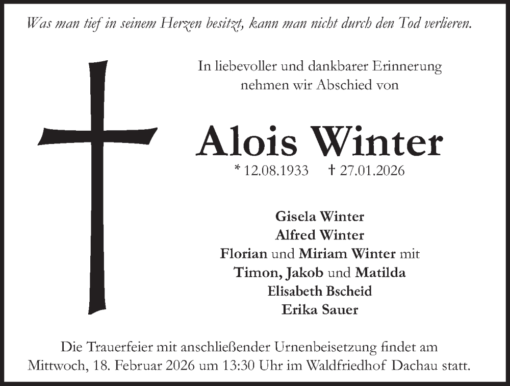 Hier finden Sie alle Traueranzeigen aus der Zeitung, die bisher für Alois Winter erschienen sind. Weitere Traueranzeigen, die in der Zeitung erscheinen, werden hier ebenfalls aufgelistet