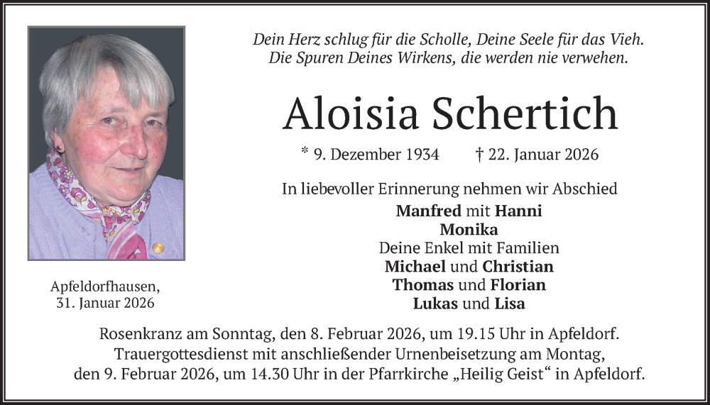 Hier finden Sie alle Traueranzeigen aus der Zeitung, die bisher für Aloisia Schertich erschienen sind. Weitere Traueranzeigen, die in der Zeitung erscheinen, werden hier ebenfalls aufgelistet