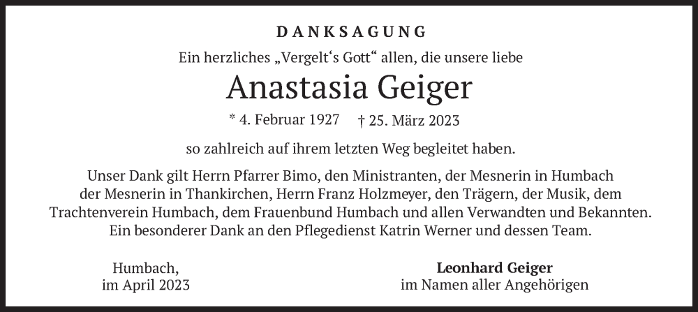 Hier finden Sie alle Traueranzeigen aus der Zeitung, die bisher für Anastasia Geiger erschienen sind. Weitere Traueranzeigen, die in der Zeitung erscheinen, werden hier ebenfalls aufgelistet