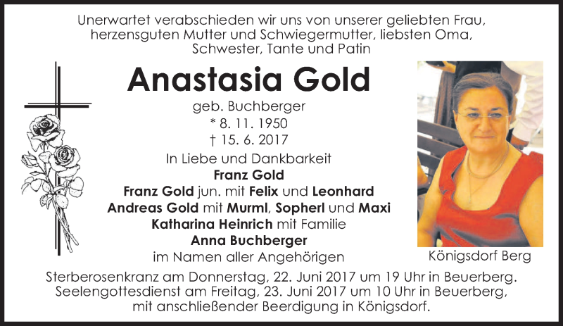 Hier finden Sie alle Traueranzeigen aus der Zeitung, die bisher für Anastasia Gold erschienen sind. Weitere Traueranzeigen, die in der Zeitung erscheinen, werden hier ebenfalls aufgelistet