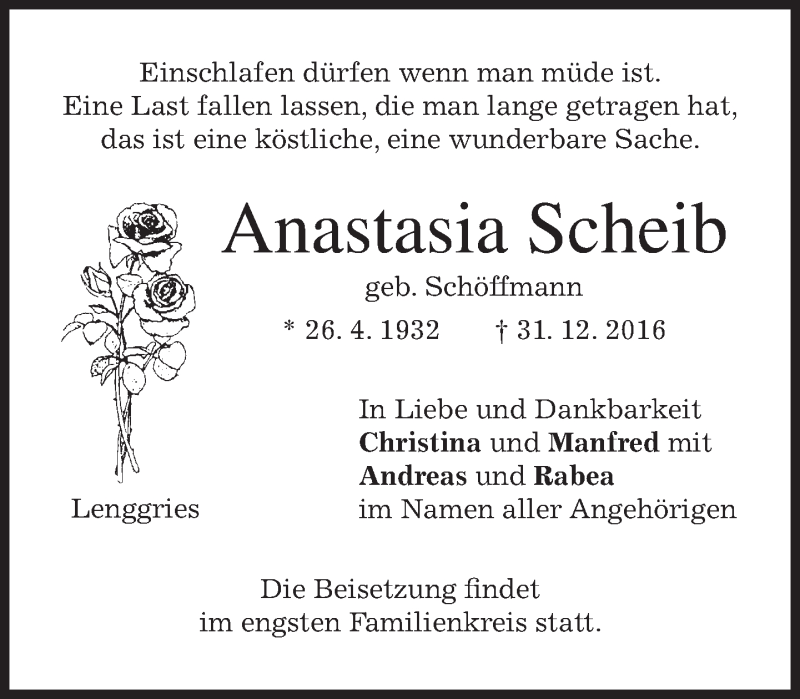 Hier finden Sie alle Traueranzeigen aus der Zeitung, die bisher für Anastasia Scheib erschienen sind. Weitere Traueranzeigen, die in der Zeitung erscheinen, werden hier ebenfalls aufgelistet