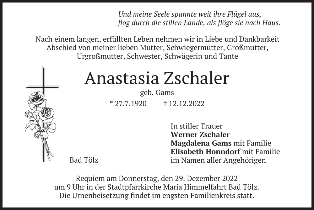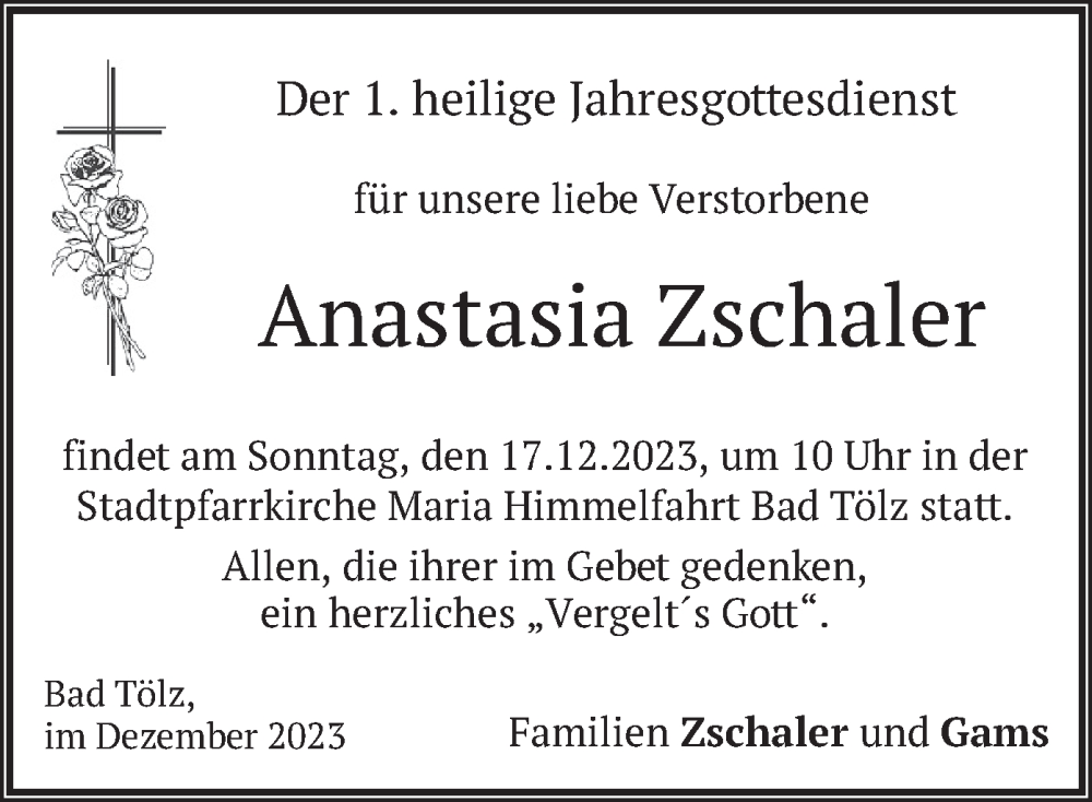 Hier finden Sie alle Traueranzeigen aus der Zeitung, die bisher für Anastasia Zschaler erschienen sind. Weitere Traueranzeigen, die in der Zeitung erscheinen, werden hier ebenfalls aufgelistet