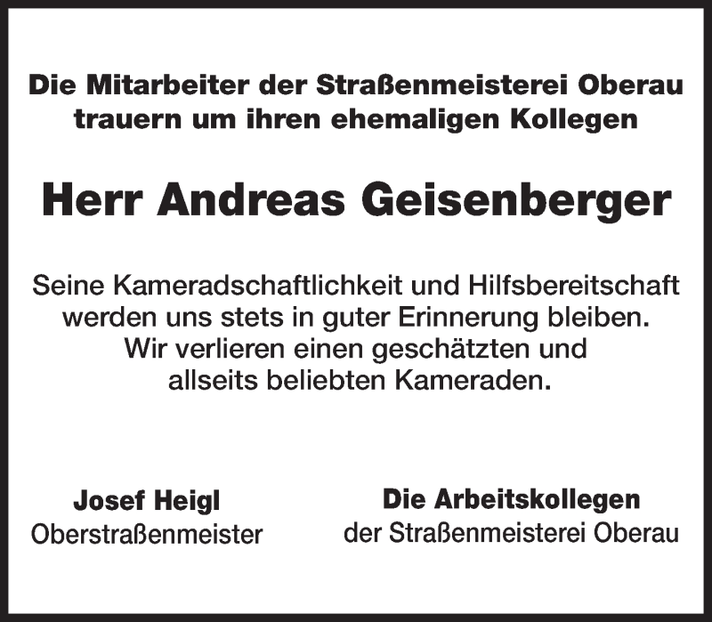 Hier finden Sie alle Traueranzeigen aus der Zeitung, die bisher für Andreas Geisenberger erschienen sind. Weitere Traueranzeigen, die in der Zeitung erscheinen, werden hier ebenfalls aufgelistet