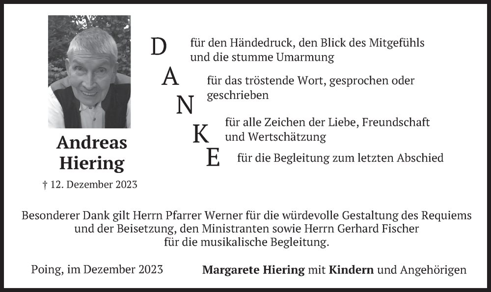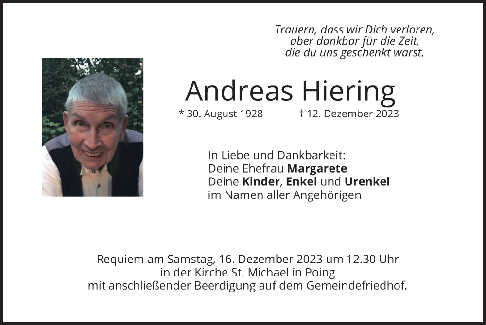 Hier finden Sie alle Traueranzeigen aus der Zeitung, die bisher für Andreas Hiering erschienen sind. Weitere Traueranzeigen, die in der Zeitung erscheinen, werden hier ebenfalls aufgelistet