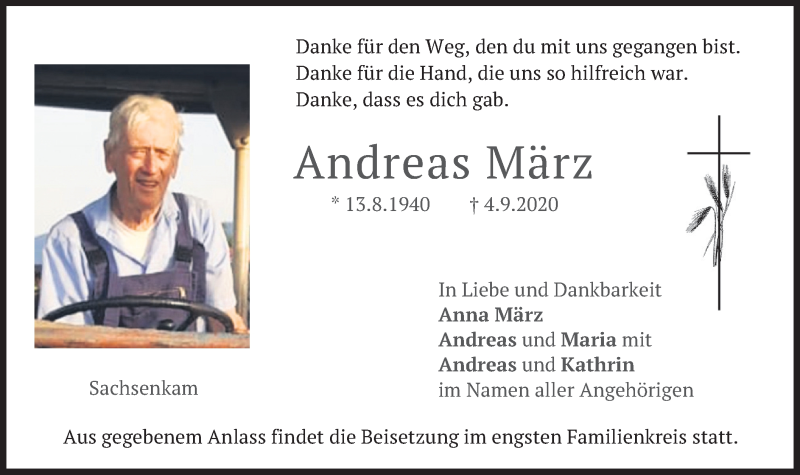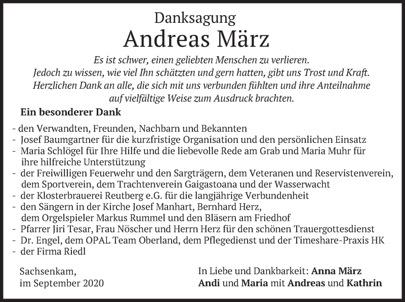 Hier finden Sie alle Traueranzeigen aus der Zeitung, die bisher für Andreas März erschienen sind. Weitere Traueranzeigen, die in der Zeitung erscheinen, werden hier ebenfalls aufgelistet
