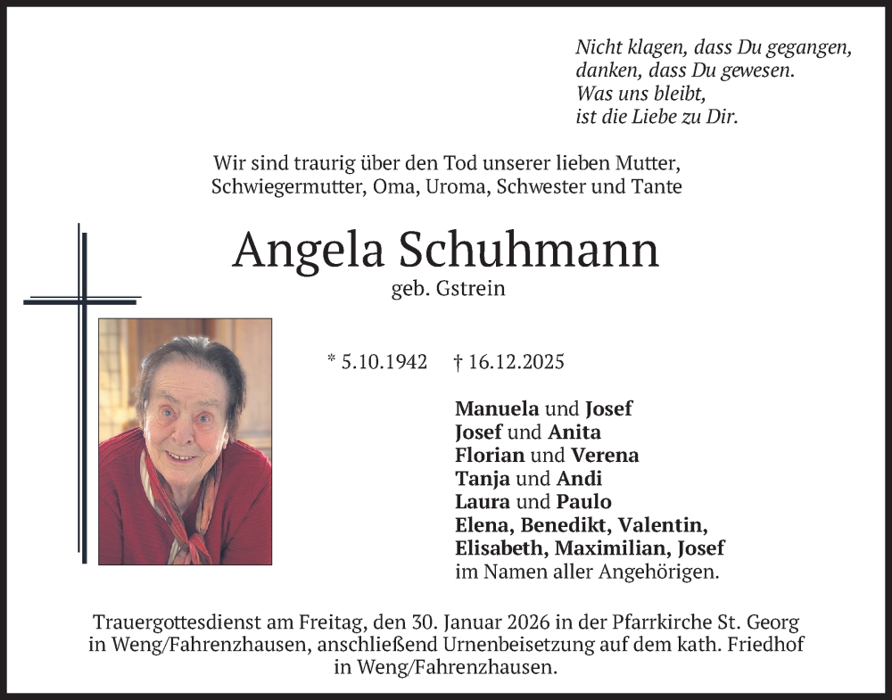 Hier finden Sie alle Traueranzeigen aus der Zeitung, die bisher für Angela Schuhmann erschienen sind. Weitere Traueranzeigen, die in der Zeitung erscheinen, werden hier ebenfalls aufgelistet