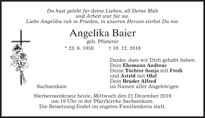 Hier finden Sie alle Traueranzeigen aus der Zeitung, die bisher für Angelika Baier erschienen sind. Weitere Traueranzeigen, die in der Zeitung erscheinen, werden hier ebenfalls aufgelistet