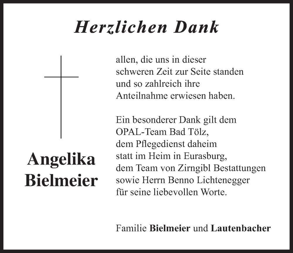 Hier finden Sie alle Traueranzeigen aus der Zeitung, die bisher für Angelika Bielmeier erschienen sind. Weitere Traueranzeigen, die in der Zeitung erscheinen, werden hier ebenfalls aufgelistet