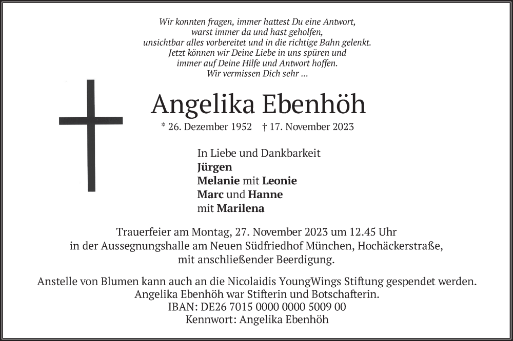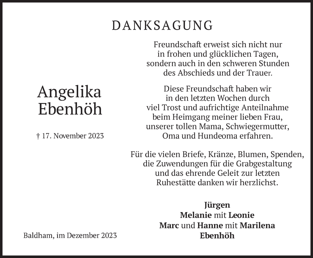 Hier finden Sie alle Traueranzeigen aus der Zeitung, die bisher für Angelika Ebenhöh erschienen sind. Weitere Traueranzeigen, die in der Zeitung erscheinen, werden hier ebenfalls aufgelistet
