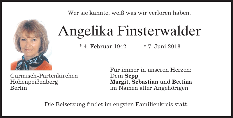 Hier finden Sie alle Traueranzeigen aus der Zeitung, die bisher für Angelika Finsterwalder erschienen sind. Weitere Traueranzeigen, die in der Zeitung erscheinen, werden hier ebenfalls aufgelistet