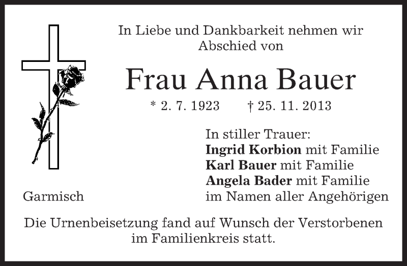 Hier finden Sie alle Traueranzeigen aus der Zeitung, die bisher für Anna Bauer erschienen sind. Weitere Traueranzeigen, die in der Zeitung erscheinen, werden hier ebenfalls aufgelistet