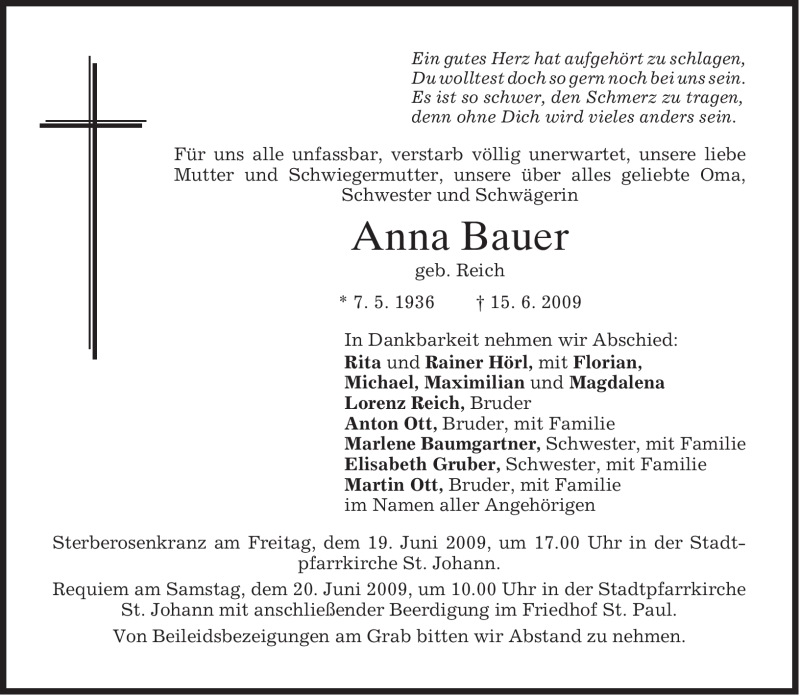 Hier finden Sie alle Traueranzeigen aus der Zeitung, die bisher für Anna Bauer erschienen sind. Weitere Traueranzeigen, die in der Zeitung erscheinen, werden hier ebenfalls aufgelistet