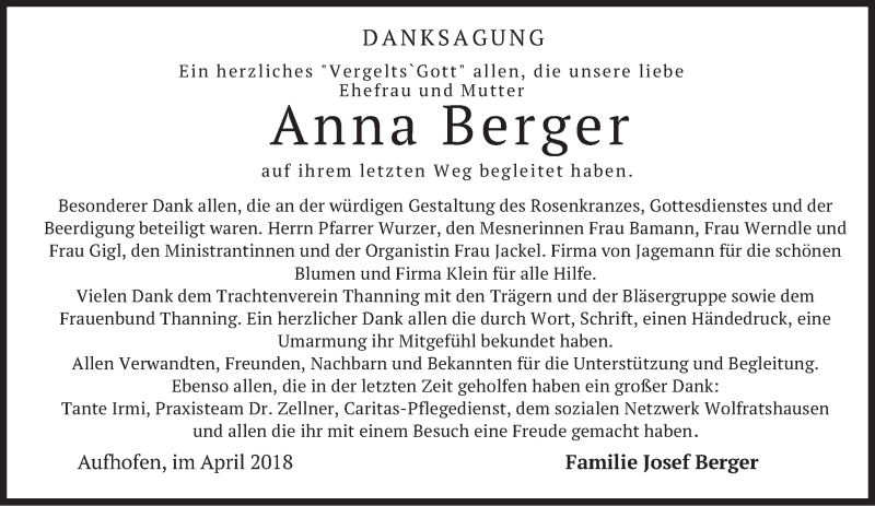 Hier finden Sie alle Traueranzeigen aus der Zeitung, die bisher für Anna Berger erschienen sind. Weitere Traueranzeigen, die in der Zeitung erscheinen, werden hier ebenfalls aufgelistet