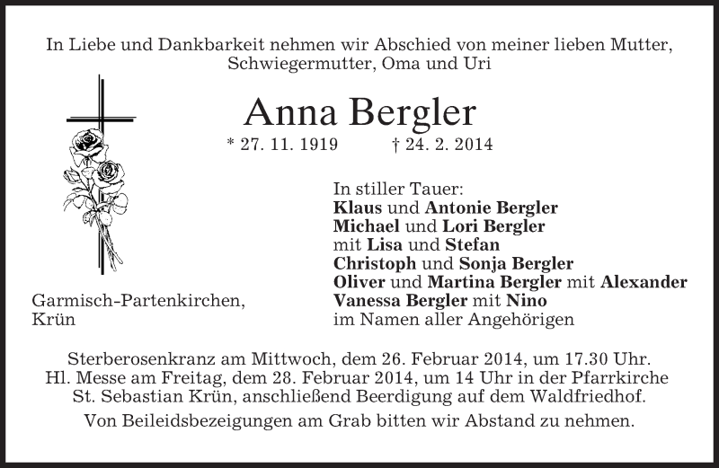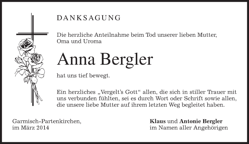 Hier finden Sie alle Traueranzeigen aus der Zeitung, die bisher für Anna Bergler erschienen sind. Weitere Traueranzeigen, die in der Zeitung erscheinen, werden hier ebenfalls aufgelistet