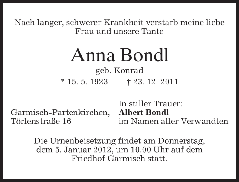 Hier finden Sie alle Traueranzeigen aus der Zeitung, die bisher für Anna Bondl erschienen sind. Weitere Traueranzeigen, die in der Zeitung erscheinen, werden hier ebenfalls aufgelistet