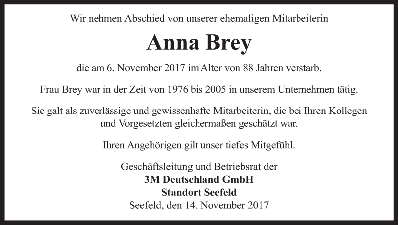 Hier finden Sie alle Traueranzeigen aus der Zeitung, die bisher für Anna Brey erschienen sind. Weitere Traueranzeigen, die in der Zeitung erscheinen, werden hier ebenfalls aufgelistet