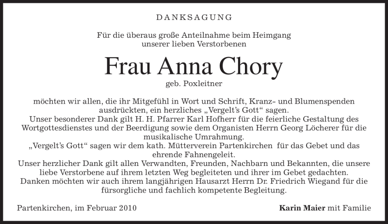 Hier finden Sie alle Traueranzeigen aus der Zeitung, die bisher für Anna Chory erschienen sind. Weitere Traueranzeigen, die in der Zeitung erscheinen, werden hier ebenfalls aufgelistet