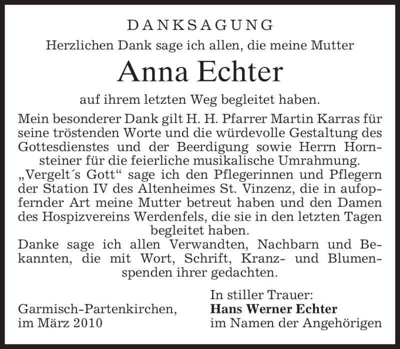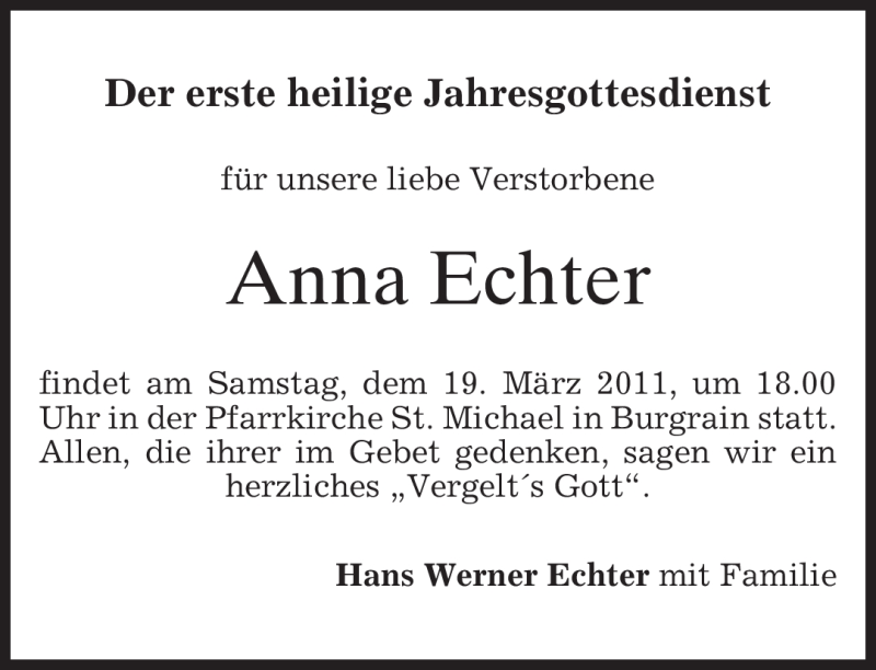 Hier finden Sie alle Traueranzeigen aus der Zeitung, die bisher für Anna Echter erschienen sind. Weitere Traueranzeigen, die in der Zeitung erscheinen, werden hier ebenfalls aufgelistet