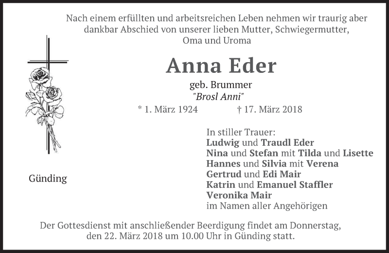 Hier finden Sie alle Traueranzeigen aus der Zeitung, die bisher für Anna Eder erschienen sind. Weitere Traueranzeigen, die in der Zeitung erscheinen, werden hier ebenfalls aufgelistet